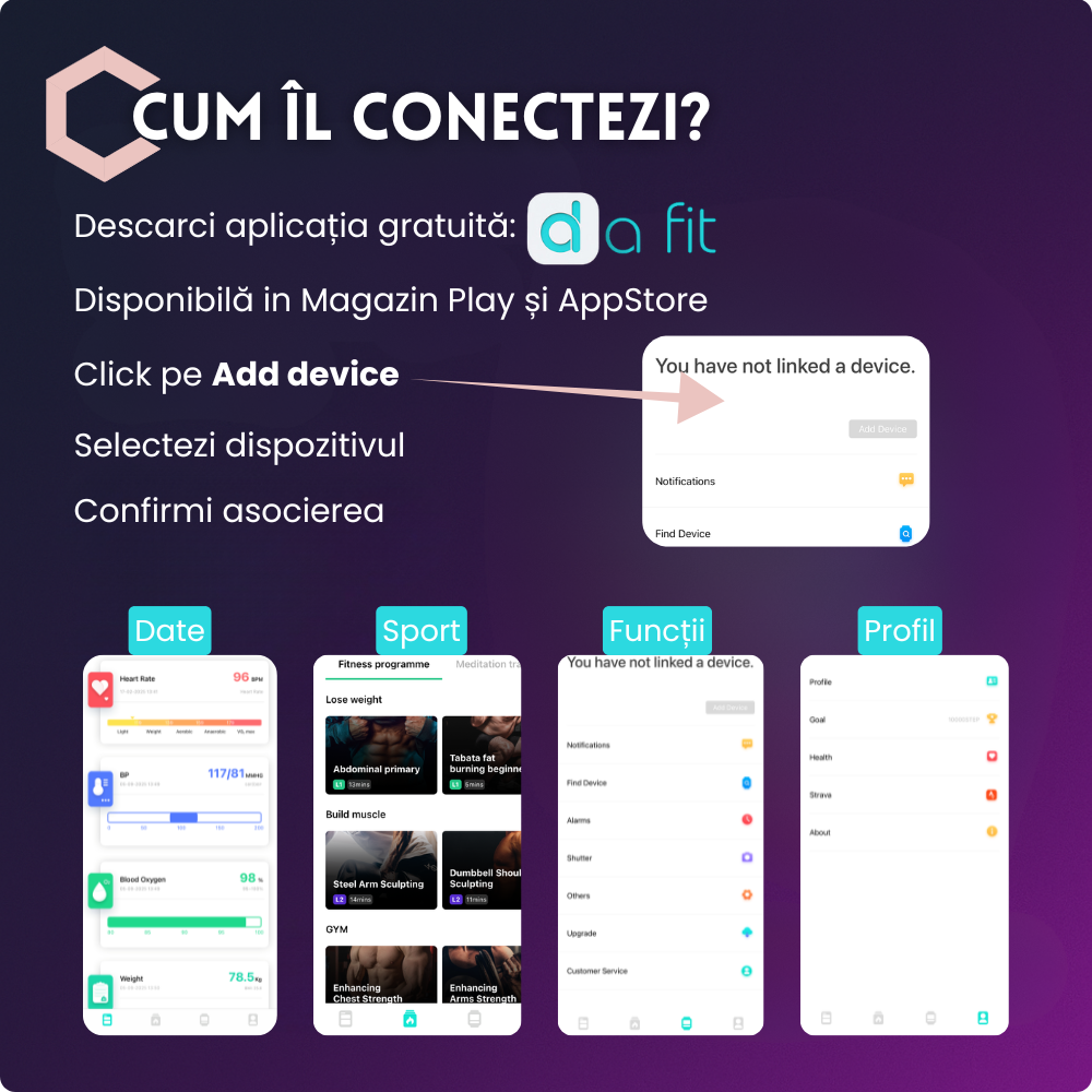 ✔ Compatibilitate universala – Functioneaza cu Android si iOS, prin aplicatia dedicata Da Fit. Este gratuita si foarte intuitiva.